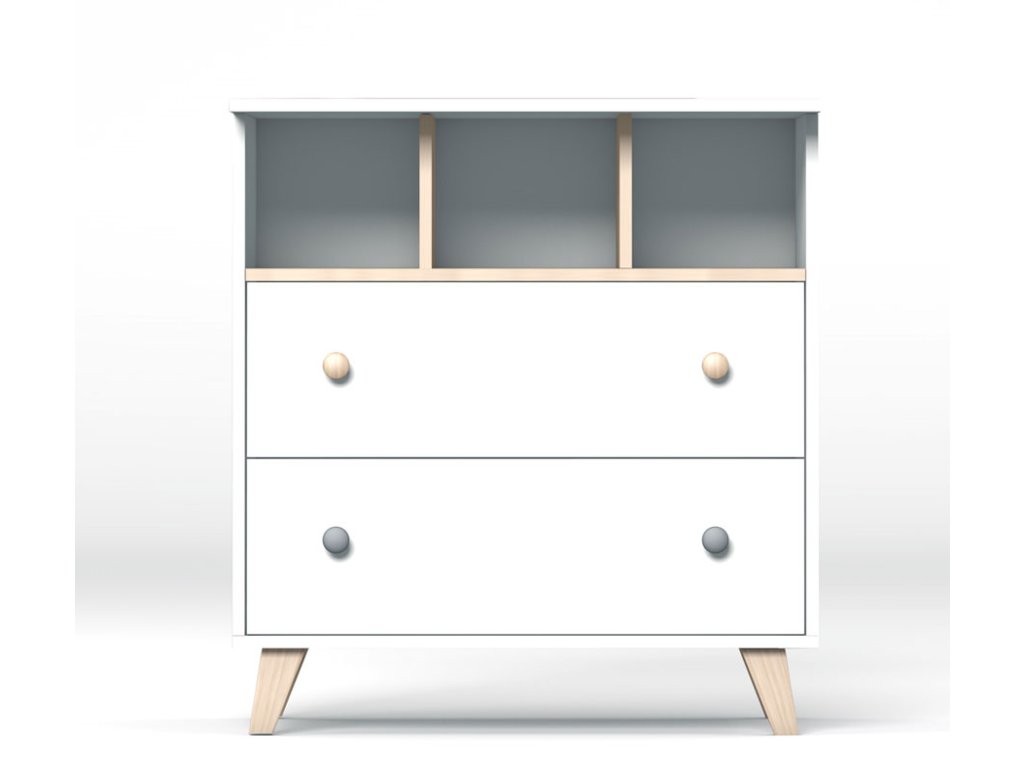 Komoda poskytne dostatok miesta na všetko potrebné pre Vaše bábätko, v hornej časti otvorená polička pre veľmi frekventované potreby alebo pre vecí, po ktorých potrebujete siahnuť ospalá poslepiačky, nižšie dve zásuvky chrániace veci pred prachom. Komoda je optimálne vysoká.