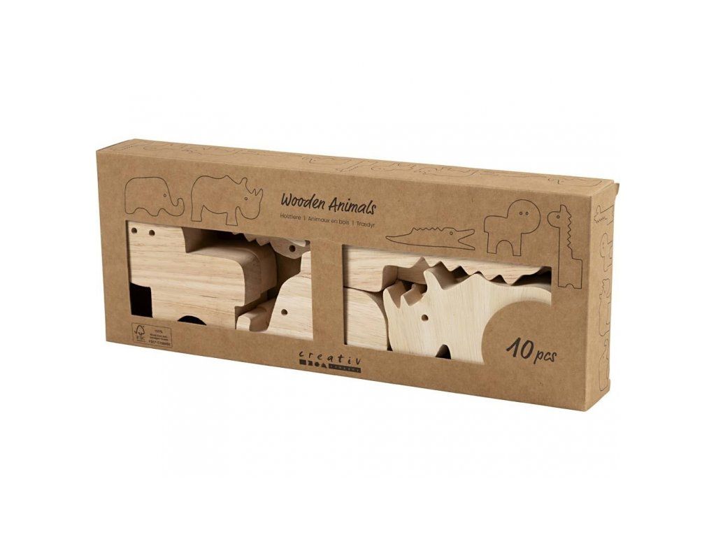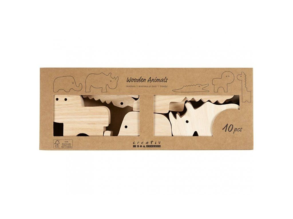 • 10 drevených figúrok safari zvierat (2× slon, 2× nosorožec, 2× krokodíl, 2× lev, 2× žirafa)