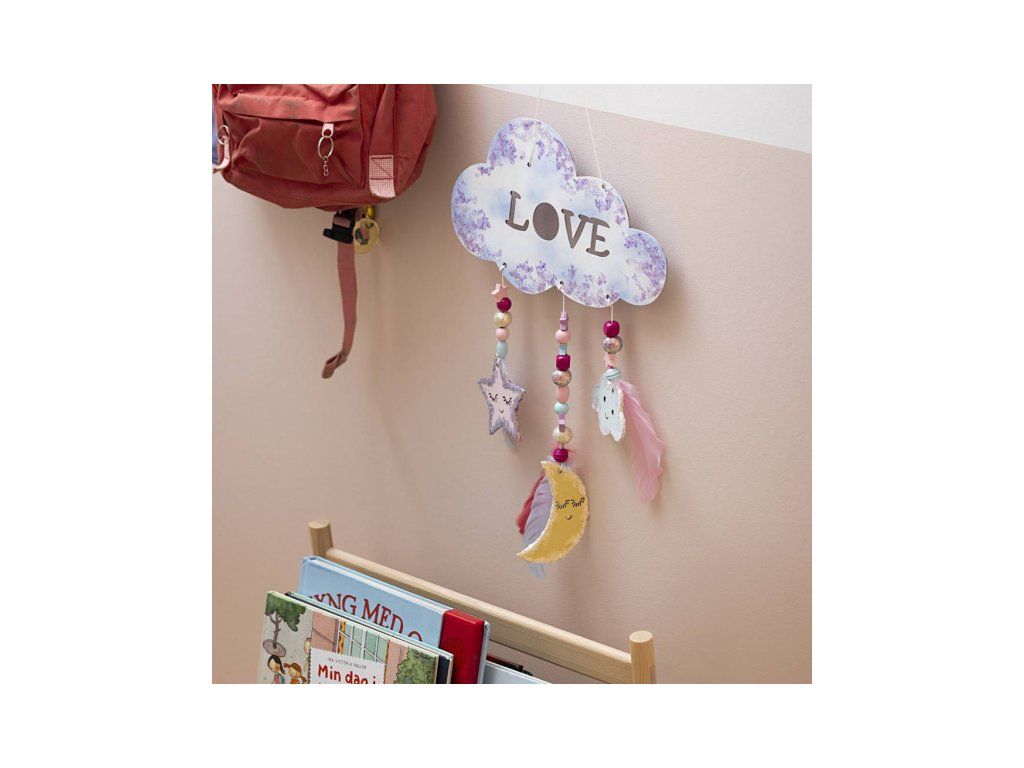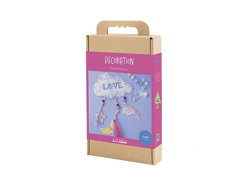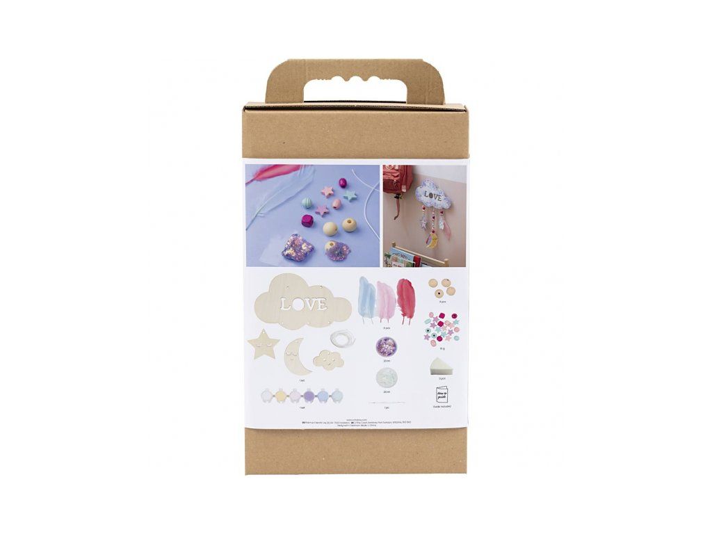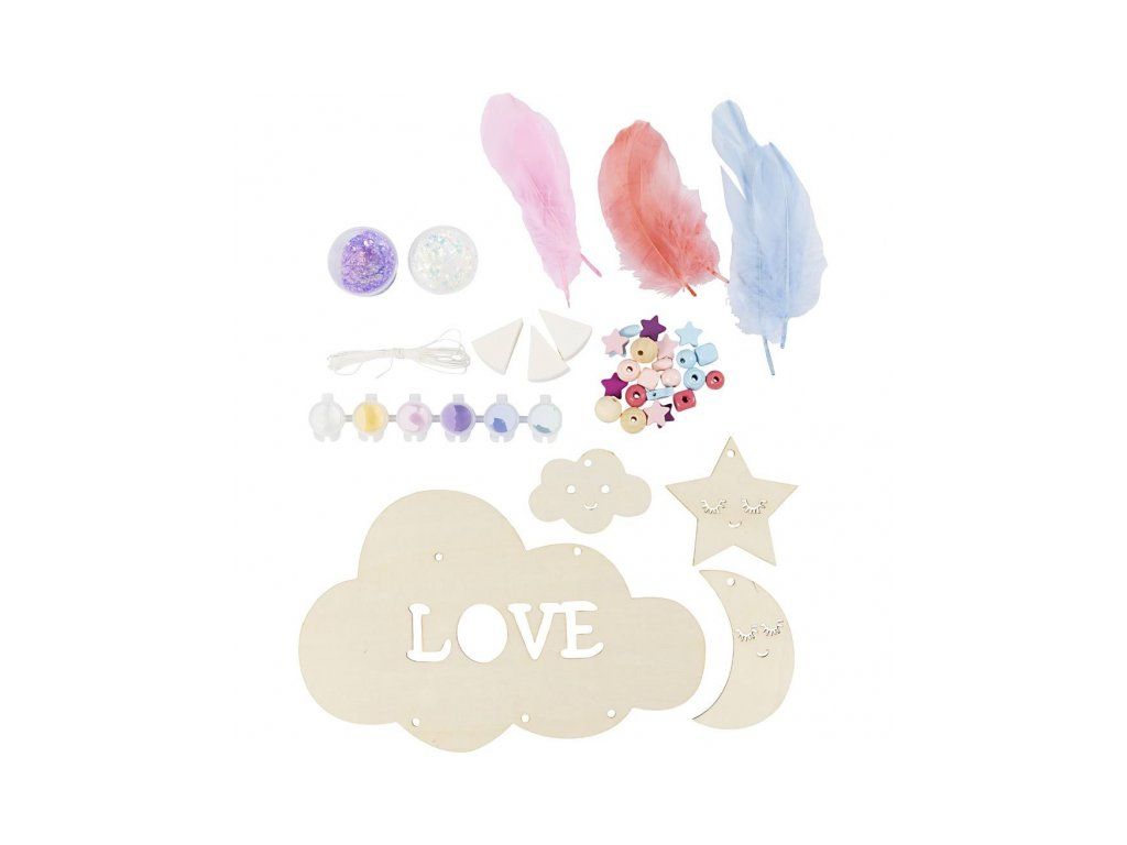 Originálna kreatívna súprava na výrobu závesnej dekorácie s motívom nočnej oblohy. Zábavná sada deťom umožní spoločne s rodičmi vytvoriť originálnu dekoráciu do detskej izby: drevenú dekoráciu si nafarbí, dozdobí trblietavou hmotou a doplní korálky a pierky pre ľahký, snový efekt. Výsledkom je krásna dekorácia, ktorú môžete zavesiť do okna, zo stropu alebo nad posteľ.