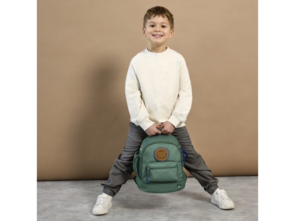 obrázek se smajlíkem na přední straně batůžku, který je možné sundat či přichytit pomocí patentky
