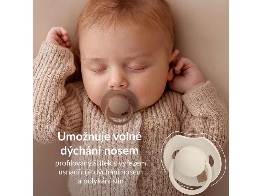 - Štítok cumlíka je špeciálne vytvarovaný pre uľahčenie dýchania nosom a prehĺtaní slín, rovnako ako pri satí z prsníka. Tvarovaný štítok čo najmenej priľne k pokožke dieťaťa, čo uľahčuje voľné prúdenie vzduchu a znižuje tak riziko podráždenia pokožky.