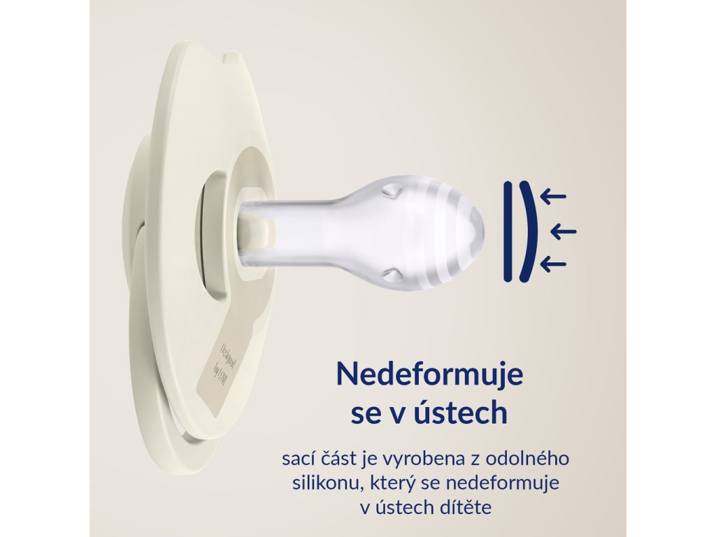 - Dynamický cumlík sa vďaka unikátnej konštrukcii zo silikónu rôznej hrúbky naťahuje a sťahuje podľa rytmu satia dieťaťa. Vďaka tomu chráni jeho sací reflex a nemá nepriaznivý vplyv na dojčenie. Symetrický tvar špičky vychádza z tvaru bradavky naplnenej mliekom, ktorá poskytuje bábätku známy pocit podobný pocitu z prsníka.