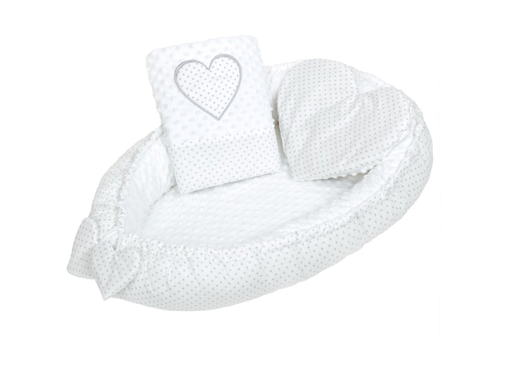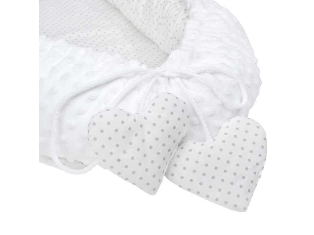 Luxusné hniezdočko s perinkou pre bábätká New Baby Srdiečko. Hniezdočko je praktický vynikajúci pomocník v prvých mesiacoch života dieťaťa. Hniezdočko je obojstranné, môže sa používať z vonkajšej aj vnútornej strany. Hniezdočko má praktickú šnúrku, s ktorou možno upravovať veľkosť, môže sa viac stiahnuť alebo úplne uvoľniť. Hniezdočko je vyrobené z dvoch typov tkanín, prvá je veľmi mäkká a na dotyk príjemná, hebká Minky látka s výstupkami pre stimuláciu senzomotoriky a druhá je 100% bavlna. Súčasťou hniezdočka je vankúšik v tvare srdca a perinka zdobená srdiečkom. Hniezdočko má mnoho využití napríklad v postieľke, v kočíku, na pohovke i na zemi. Rozmery: cca 55x75 cm, vnútorné rozmery: cca 35x59 cm. Perinka: Rozmery: 65x47 cm. Zloženie: jedna strana 100% bavlna, druhá strana Minky 100% polyester, výplň: antialergické vlákno.