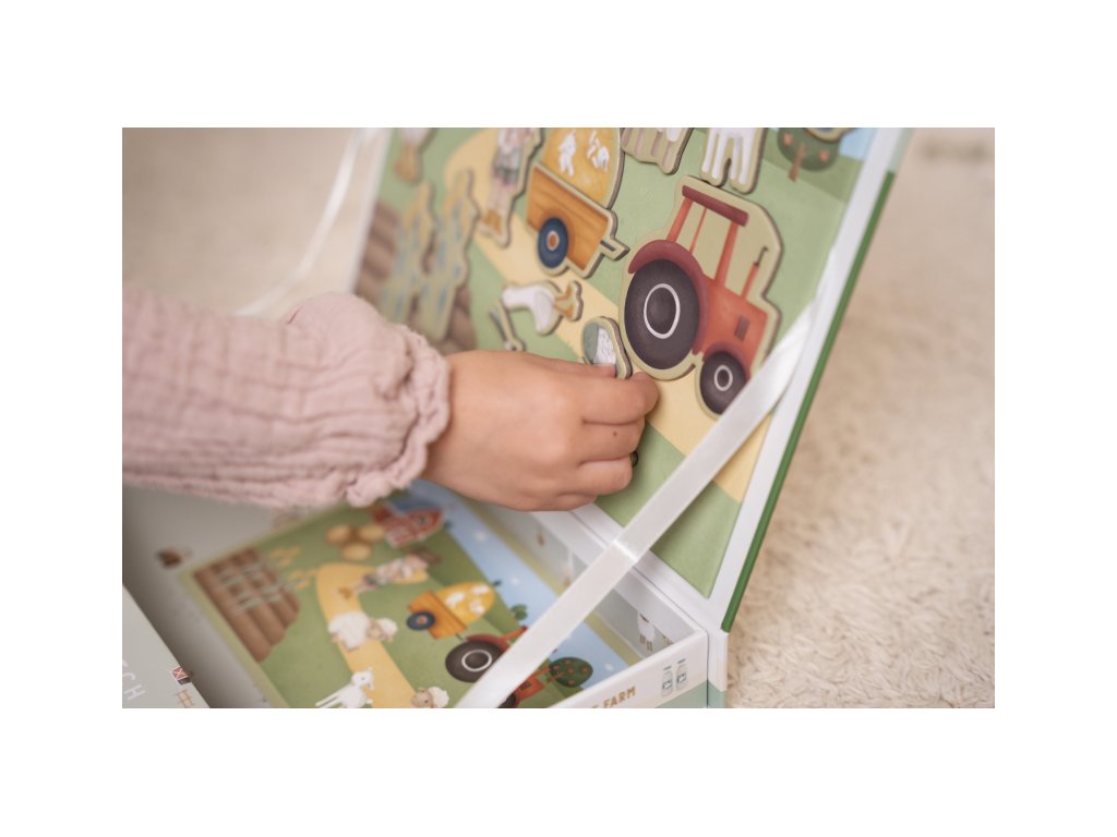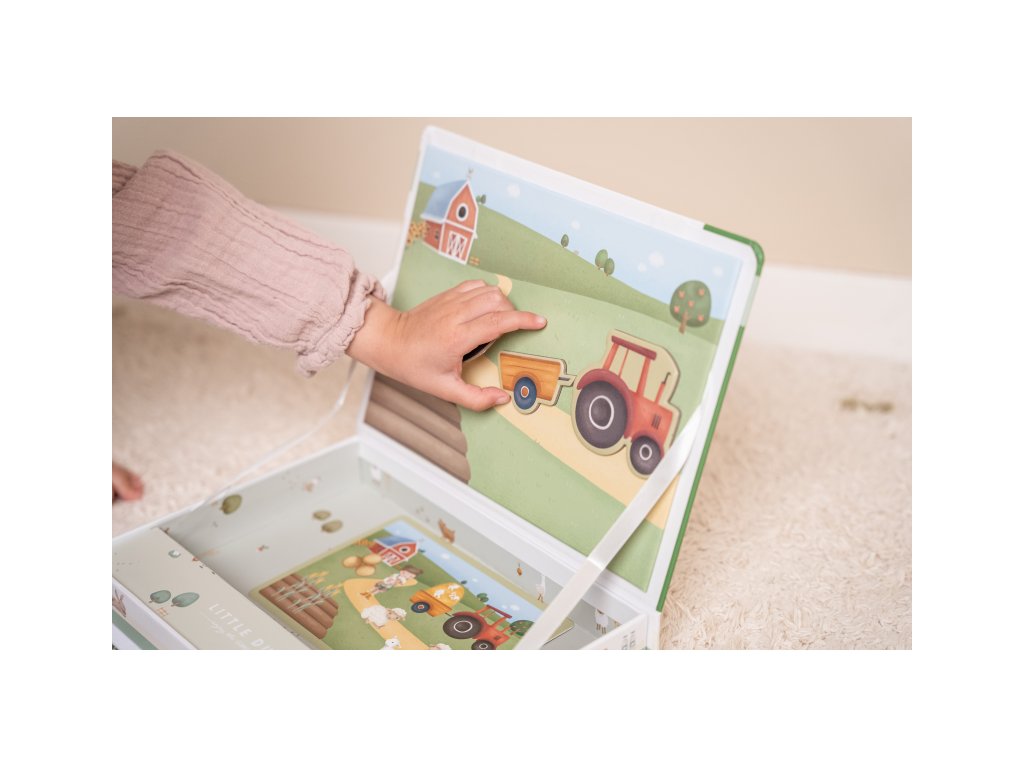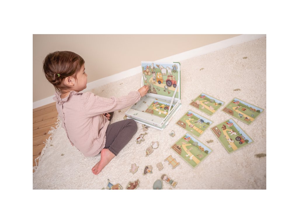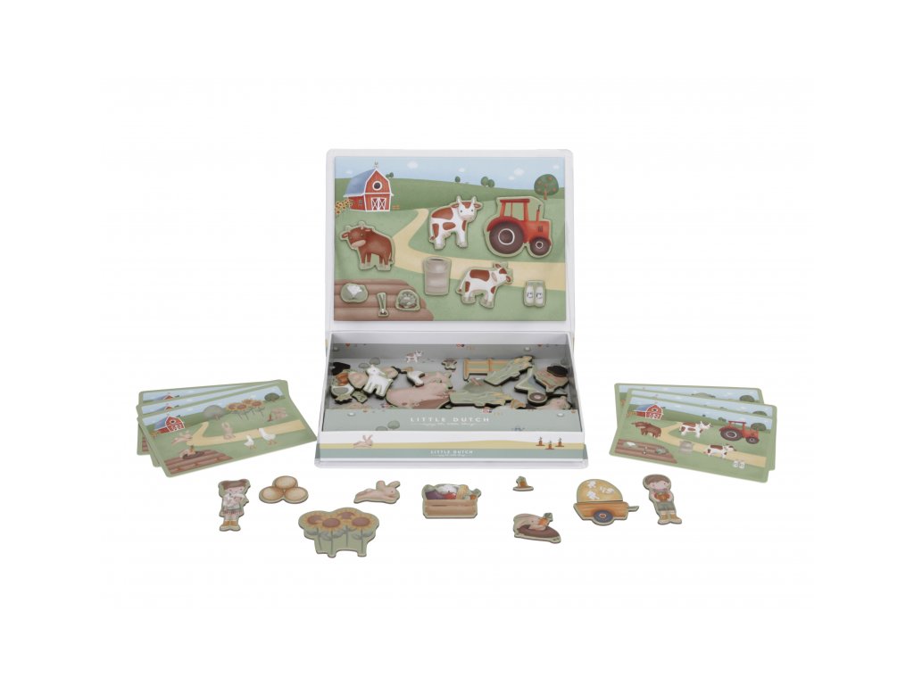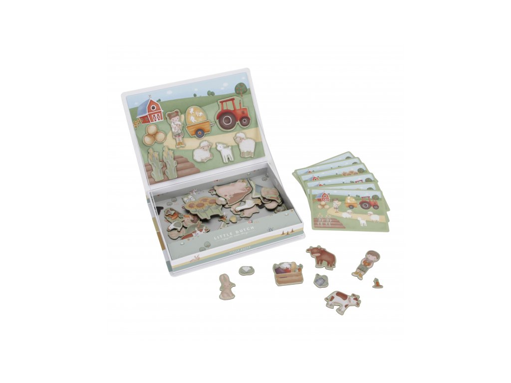 Magnetická hra sa skladá z magnetických dielov s motívmi zo života na farme a 6 vzorových kariet. Magnetické veko je možné použiť ako hernú dosku.