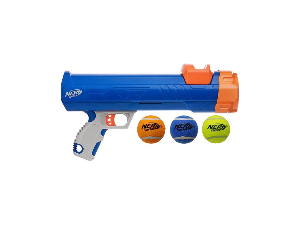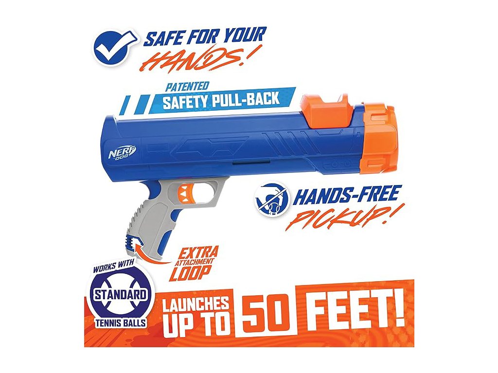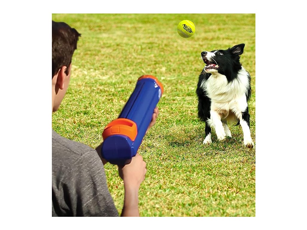 Nerf Dog Toy Blaster je ručne ovládaná hračka - zbraň určená na hru aportovania s vašim psom. Hračka sa používa tak, že naberiete jednu z priložených tenisových loptičiek do hlavice, stlačíte alebo natiahnete mechanizmus a vypustíte loptičku na väčšiu vzdialenosť, čím pes má výzvu ju chytiť a priniesť späť.V balení sú okrem blasteru aj 3 pískacie tenisové loptičky s priemerom približne 5 cm – loptičky vydávajú zvuk pri hryzení alebo stlačení, čo zvýrazňuje záujem psa o hru. Hračka je primárne navrhnutá na použitie vonku, kde je dostatok priestoru pre beh, aportovanie a sledovanie letu loptičky.