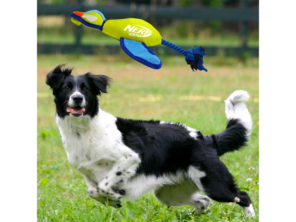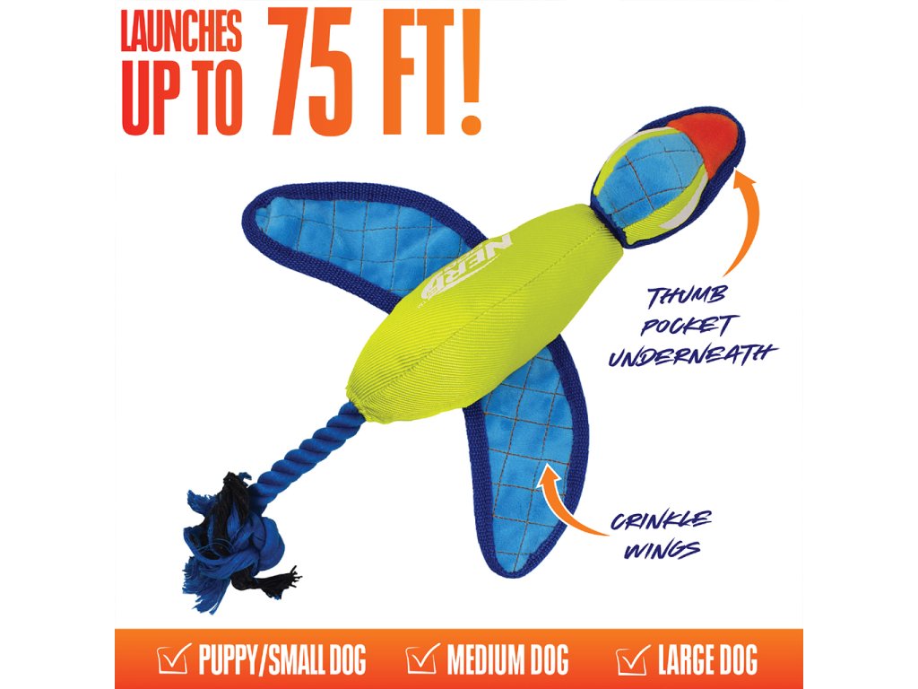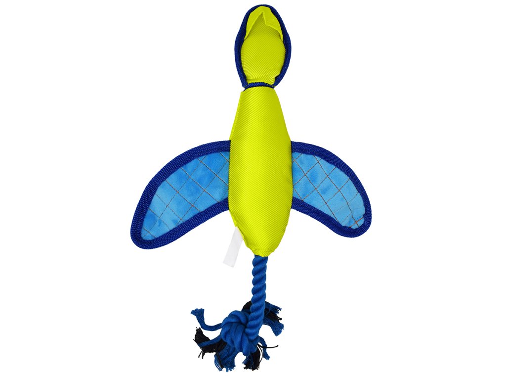 Hračka s dĺžkou približne 42 cm je navrhnutá pre aktívnu hru aportovania so psom – ideálna pre beh, odpaľovanie a chytanie na väčšiu vzdialenosť. Vysoký pomer zábavy zaisťuje dve hlavné vlastnosti: šuštiace krídla, ktoré pri hre vydávajú zvuk a stimulujú psa, a robustná konštrukcia z nylonu a odolných materiálov, ktorá zvládne časté hody a aportovanie v exteriéri.Hračka funguje ako tzv. „launching“ model – môže byť hodená na väčšiu vzdialenosť, čím poskytuje psovi väčší priestor na útek a následný návrat s hračkou. Je určená na vonkajšie použitie, ideálna na veľké trávnaté plochy alebo parky, kde pes má dostatok miesta na rozbeh.