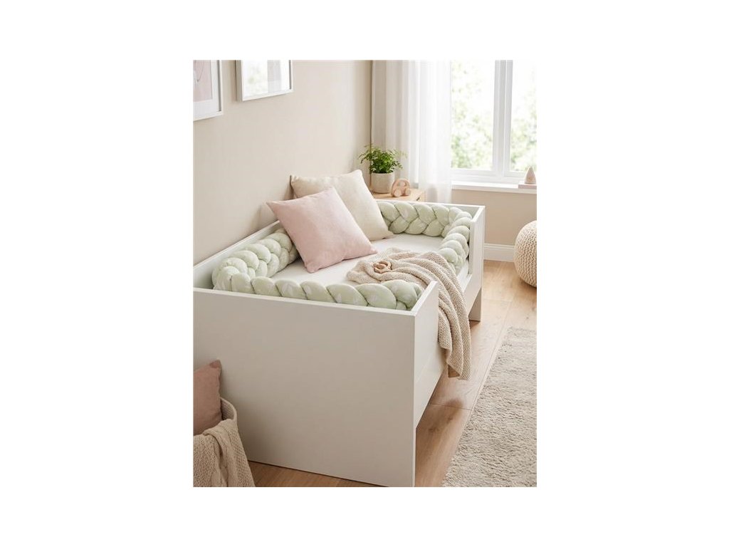 Hebučký a praktický pletený vrkoč New Baby je modernou alternatívou tradičného alebo vankúšového mantinelu nielen do detskej postieľky. Všetky tri pramene sú vyrobené z veľmi kvalitného bavlneného materiálu a antialergickej polyesterovej výplne a ručne spletených do vrkoča. Môžete ho použiť v postieľke, kolíske, kde chráni dieťa pred tvrdými priečkami postieľky a izoluje od studenej steny. Mantinel sa prispôsobí každej postieľke a pomocou troch priložených stúh ho ľahko upevníte. Staršie dieťa ho môže využívať pre zábavu alebo ako originálnu dekoráciu detskej izby.