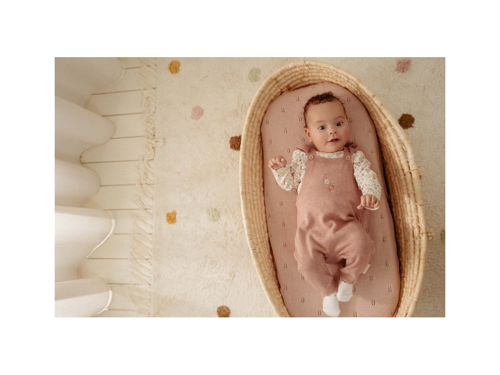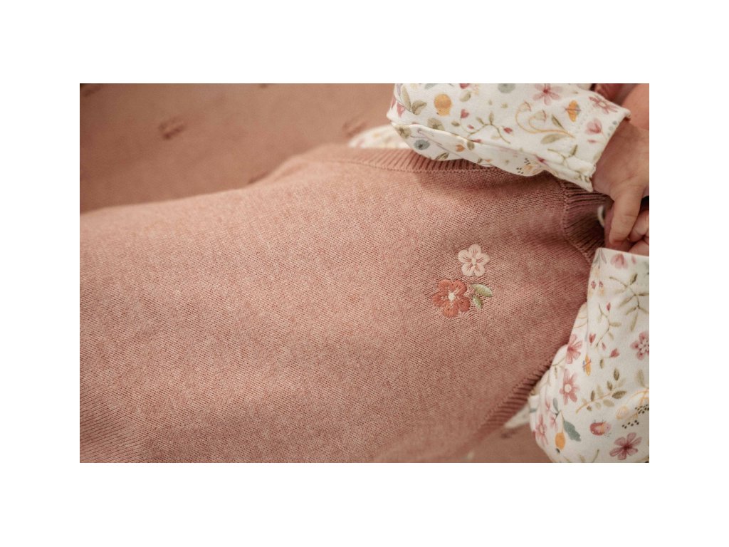 Overal z z mäkkej príjemnej pleteniny z organickej bavlny s krásnou kvetinovou výšivkou a zapínaním na gombíky je ideálny pre kombinovanie s tričkom, body-čkami aj kardiganom.