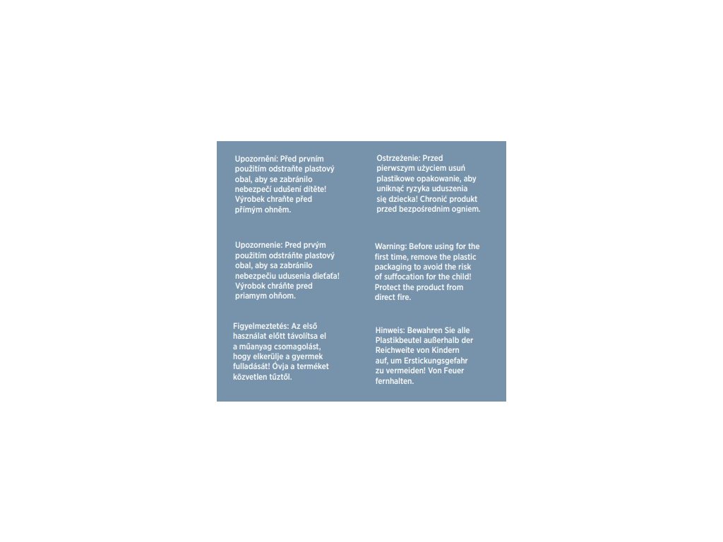 UPOZORNENIE! Pred prvým použitím odstráňte plastový obal, aby sa zabránilo nebezpečiu udusenia dieťaťa! Výrobok chráňte pred priamym ohňom.