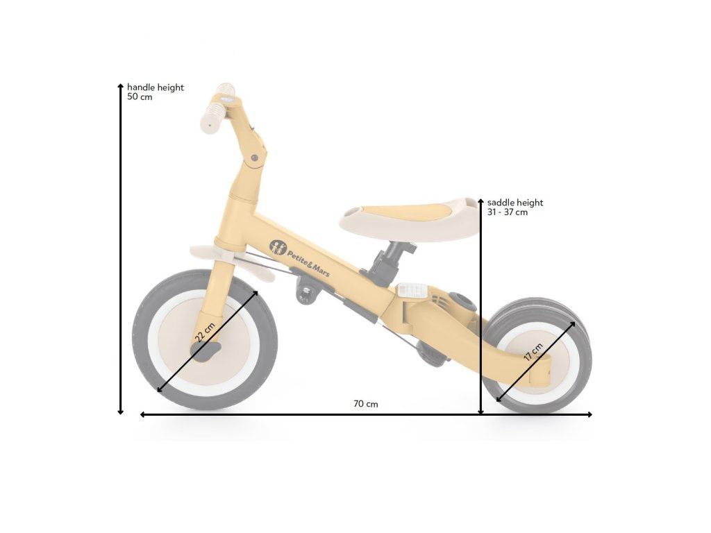 - v trojkolesovej verzii má dĺžku 67 cm, šírku 46 cm a nastaviteľnú výšku sedla od 31 do 37 cm.