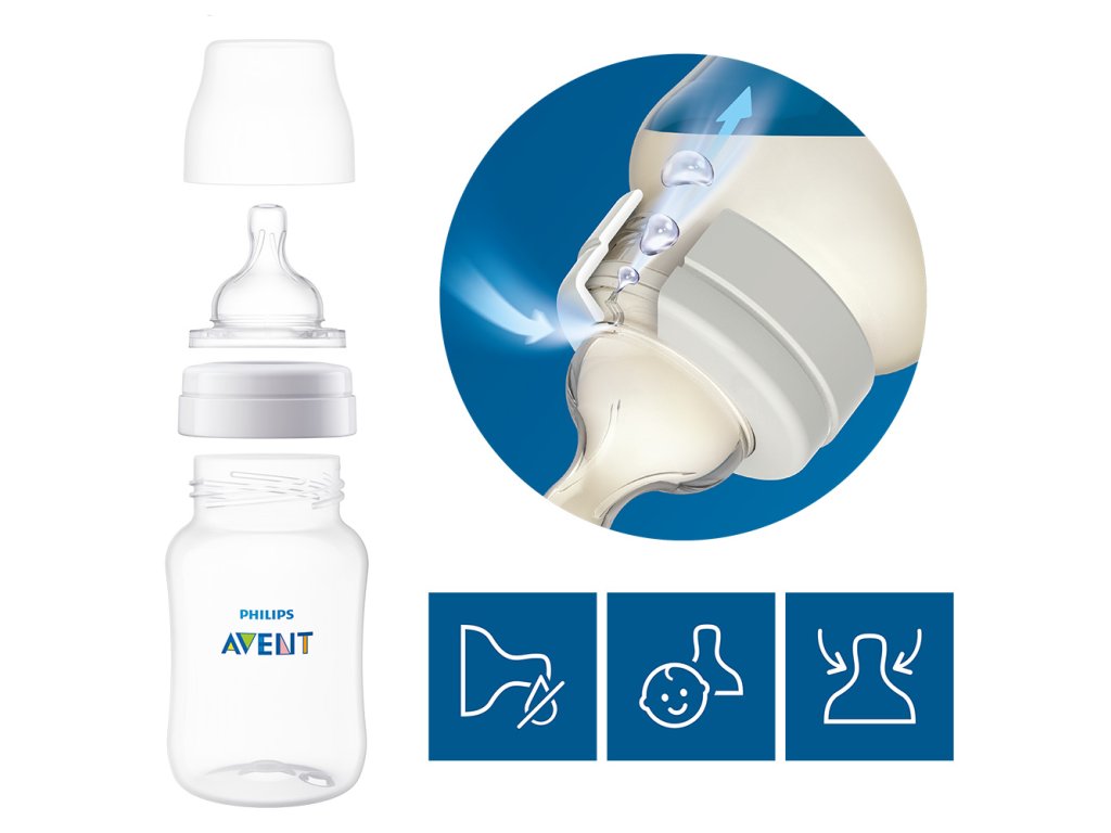 Dojčenské fľaše AVENT Anti-colic musia byť používané s priehľadným cumlíkom AVENT Anti-colic, ktorý má na základni tesniaciu manžetu.