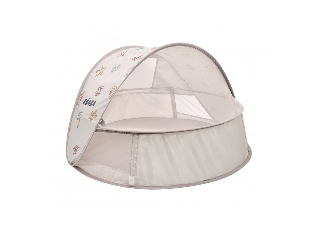 Prenosný univerzálny stan s UV faktorom 50+ na ochranu dieťaťa pred slnkom na záhrade, na pláži či na výletoch do prírody. Stan umožňuje ľahkú ventiláciu vďaka bočným otvorom so sieťovinou a textilnými chlopňami, ktoré je možné zrolovať. Sieťovina chráni dieťa v stane pred ťažkým hmyzom. Tkanina s chladivým efektom pomáha znižovať teplotu vo vnútri stanu.