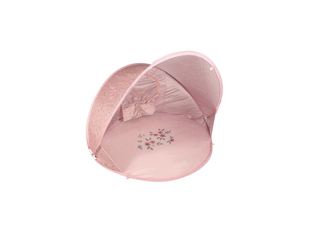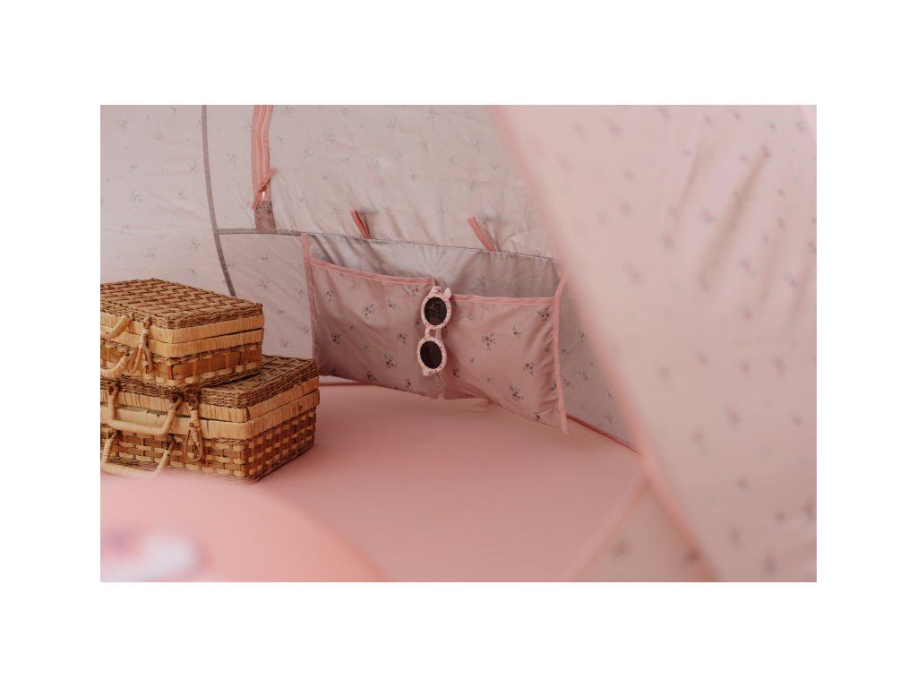 Prenosný skladací stan s UV faktorom 40+ na ochranu dieťaťa pred slnkom na záhrade, na pláži či na výletoch do prírody. Stan umožňuje jednoduchú ventiláciu vďaka zadnému okienku na zips. Dve vrecká na vnútornej stene ponúkajú priestor na uloženie drobností.