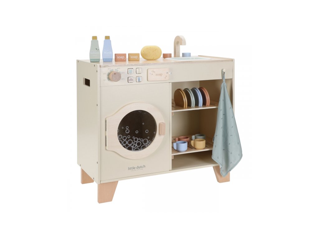 Štýlový drevený set práčky a drezu Little Dutch poteší každé dieťa, ktoré sa rado stará o svoje bábiky či plyšáky. V práčke im vyperie ich oblečenie, v dreze umyje riad, na ktorom servírovalo bábikám desiatu. Vďaka otočným gombíkom, tlačidlám aj vysúvacej priehradke na prací prostriedok pôsobí práčka aj drez realisticky a podnecujú deti k napodobňovaniu domácich prác. Súčasťou balenia je bohaté príslušenstvo: štyri šálky, štyri podšálky, špongia, prací prostriedok, mydlové kocky a látková utierka.