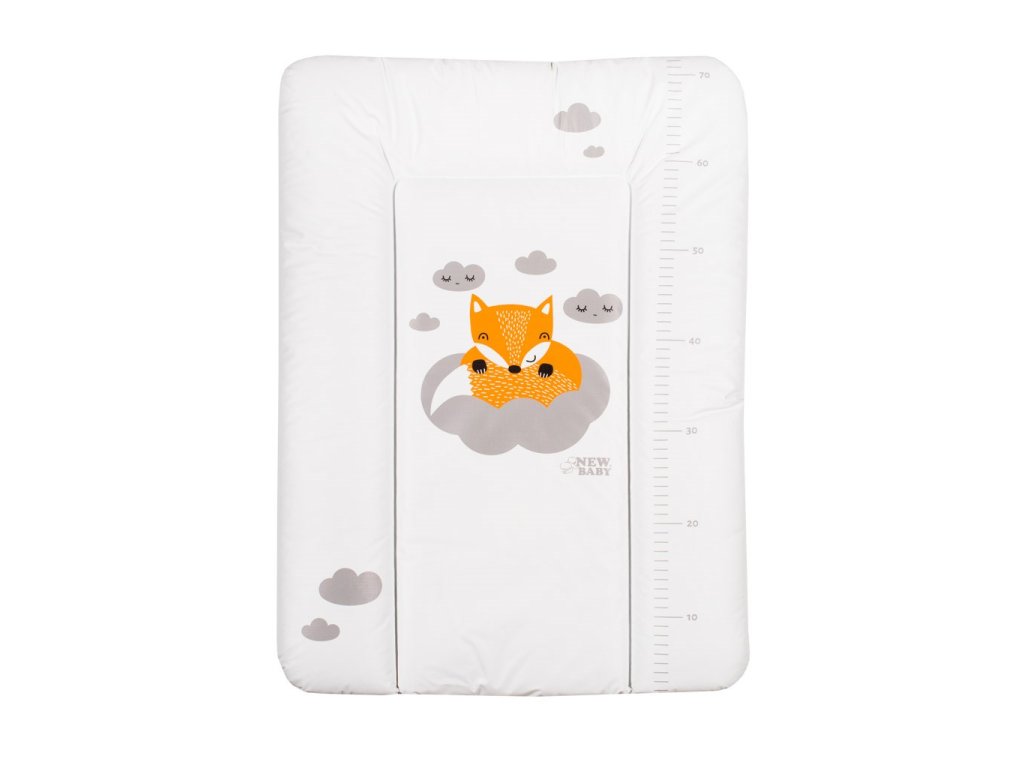 Praktická tvarovaná prebaľovacia podložka s moderným dizajnom New Baby Líška z nepremokavého, plastového materiálu s obrázkom líšky a obláčikov. Podložku možno použiť na komode či inom mieste na prebaľovanie. Rozmer: cca 70x50 cm, hrúbka cca 4 cm.