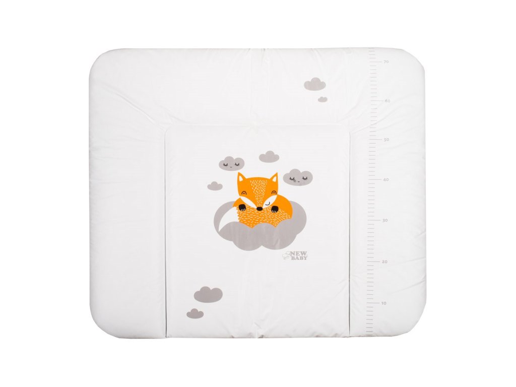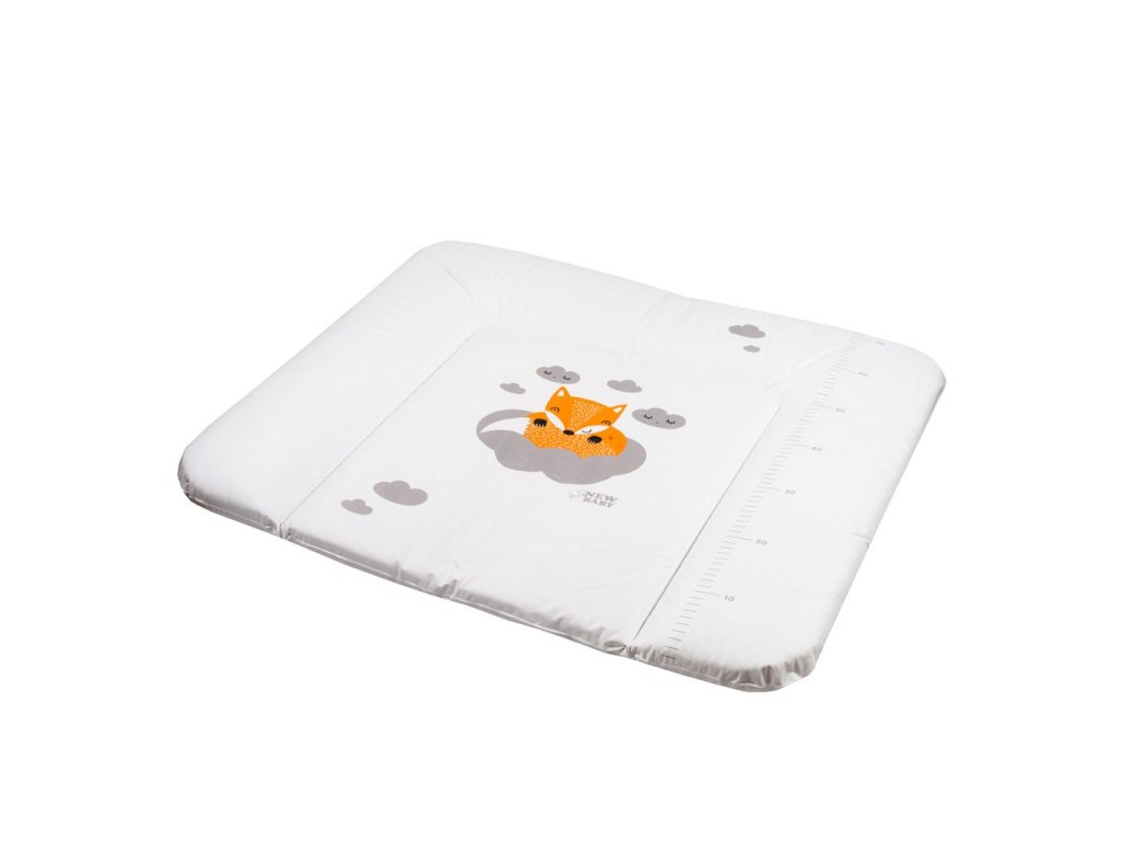 Praktická tvarovaná prebaľovacia podložka s moderným dizajnom New Baby Líška z nepremokavého, plastového materiálu s obrázkom líšky a obláčikov. Podložku možno použiť na komode či inom mieste na prebaľovanie. Rozmer: cca 85x70 cm, hrúbka cca 4 cm.