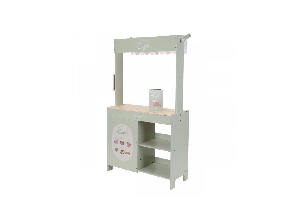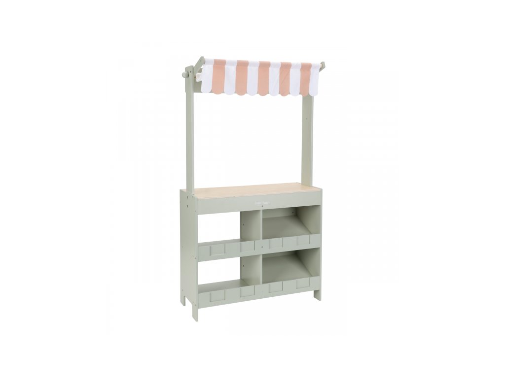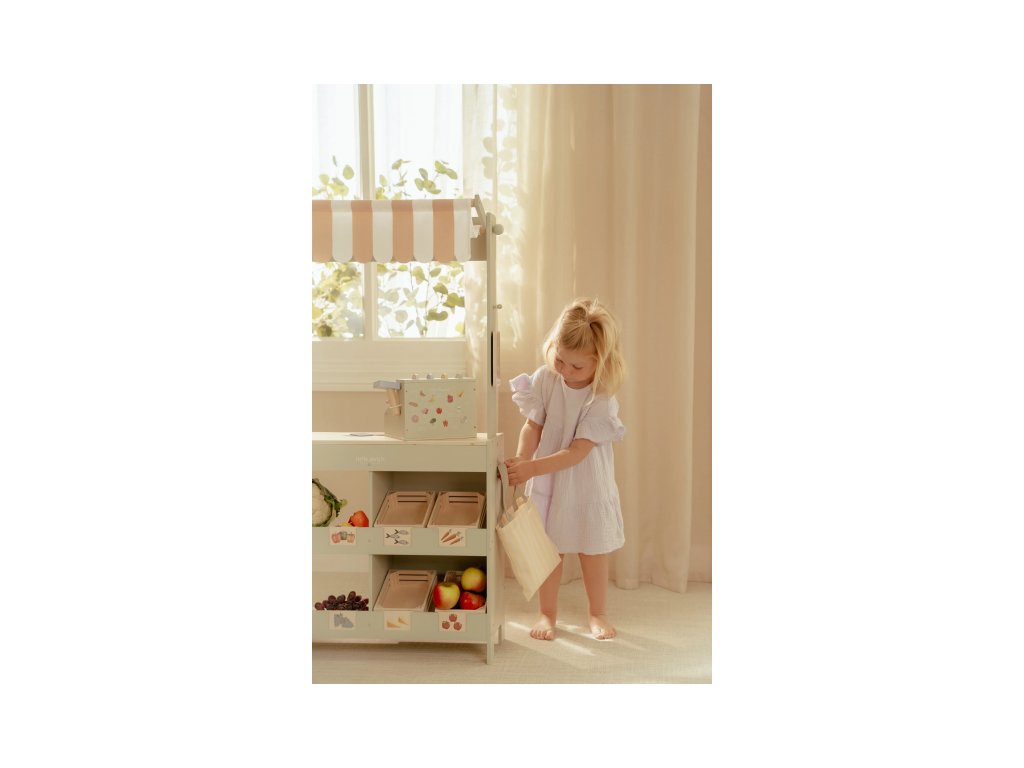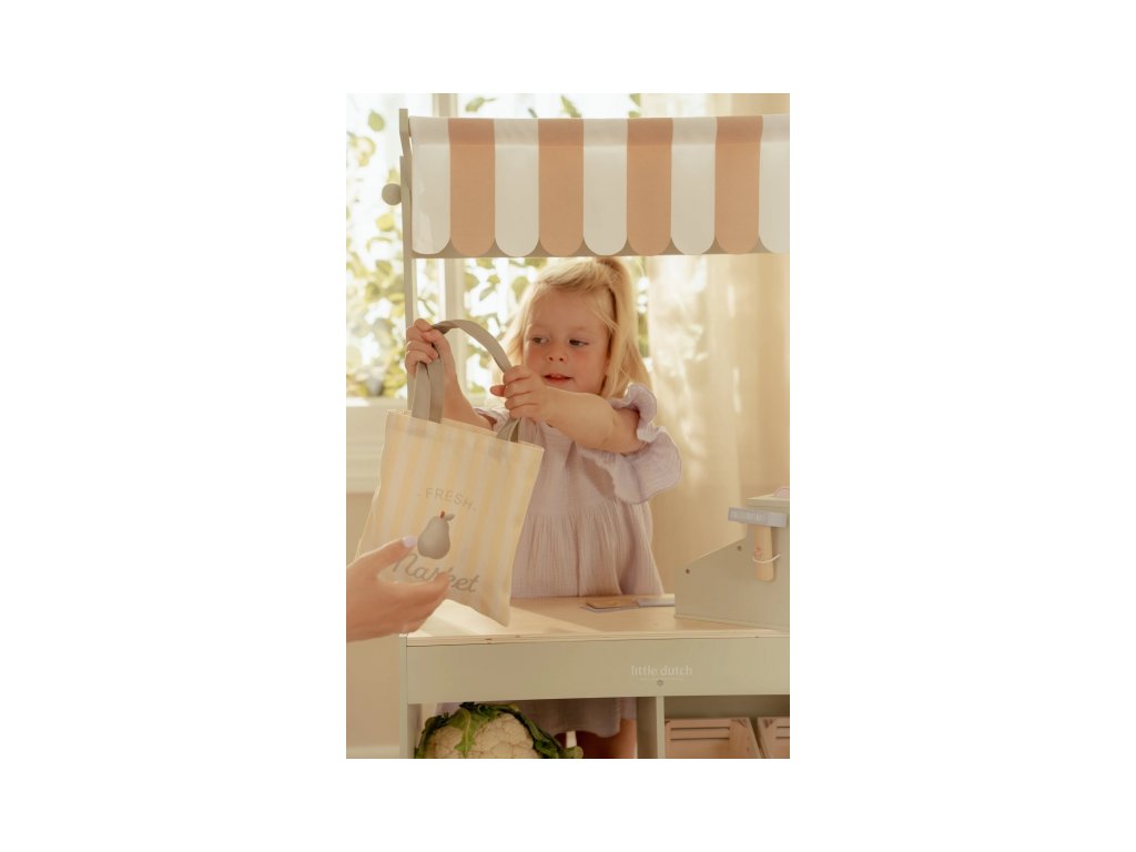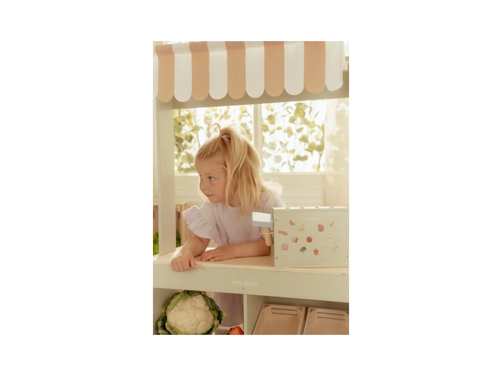Krásne spracovaný predajný stánok Little Dutch je skvelý základ pre obľúbenú hru na obchod, pri ktorej sa fantázii medze nekladú! Deti si môžu zahrať na predavača čerstvej zeleniny a ovocia alebo obsluhovať hostí vo svojej vlastnej cukrárni plnej sladkých dobrôt.Vďaka šikovnému obojstrannému dizajnu sa farmársky stánok ľahko premení na štýlovú kaviareň. Na jednej strane nájdete predajný pult, pruhovanú markízu, textilnú nákupnú tašku a dostatok miesta na vystavenie tovaru vrátane štyroch debničiek na ovocie a zeleninu. Po otočení stánku sa otvorí kaviarenská časť s ilustrovaným menu a štyrmi výstavnými priehradkami na zákusky.