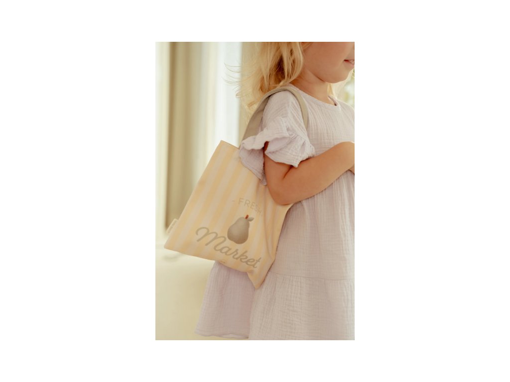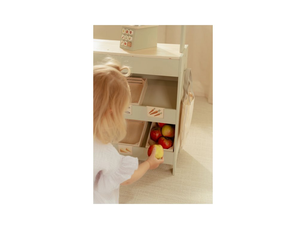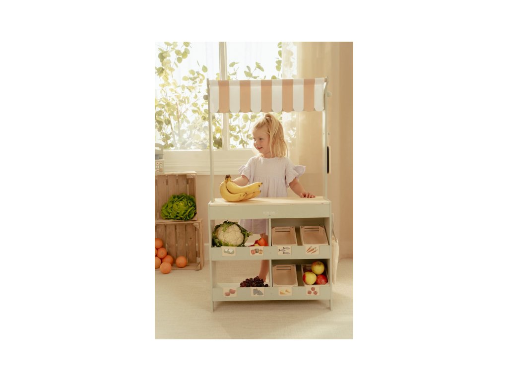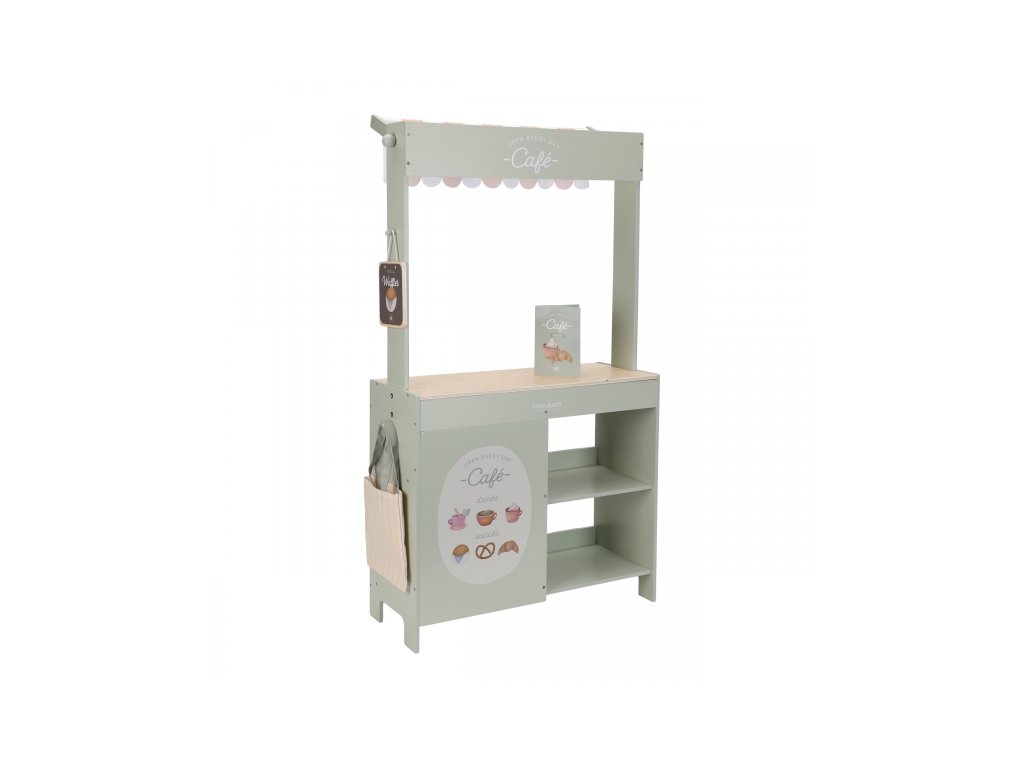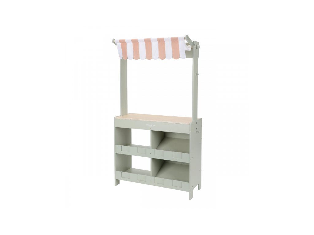 Krásne spracovaný predajný stánok Little Dutch je skvelý základ pre obľúbenú hru na obchod, pri ktorej sa fantázii medze nekladú! Deti si môžu zahrať na predavača čerstvej zeleniny a ovocia alebo obsluhovať hostí vo svojej vlastnej cukrárni plnej sladkých dobrôt.Vďaka šikovnému obojstrannému dizajnu sa farmársky stánok ľahko premení na štýlovú kaviareň. Na jednej strane nájdete predajný pult, pruhovanú markízu, textilnú nákupnú tašku a dostatok miesta na vystavenie tovaru vrátane štyroch debničiek na ovocie a zeleninu. Po otočení stánku sa otvorí kaviarenská časť s ilustrovaným menu a štyrmi výstavnými priehradkami na zákusky.