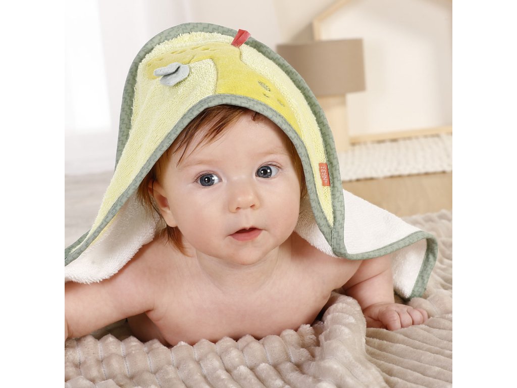 Savá detská osuška s motívom roztomilého dinosaura bábätko jemne usuší a ochráni pred chladom a prievanom. Mäkký nadýchaný materiál pozýva na bezpečné a pohodlné zababušenie po kúpeli. Uterák je vhodný na každodenné použitie. Možno ho prať v práčke na 60 °C . Pomocou praktického pútka je možné uterák zavesiť na vešiak.