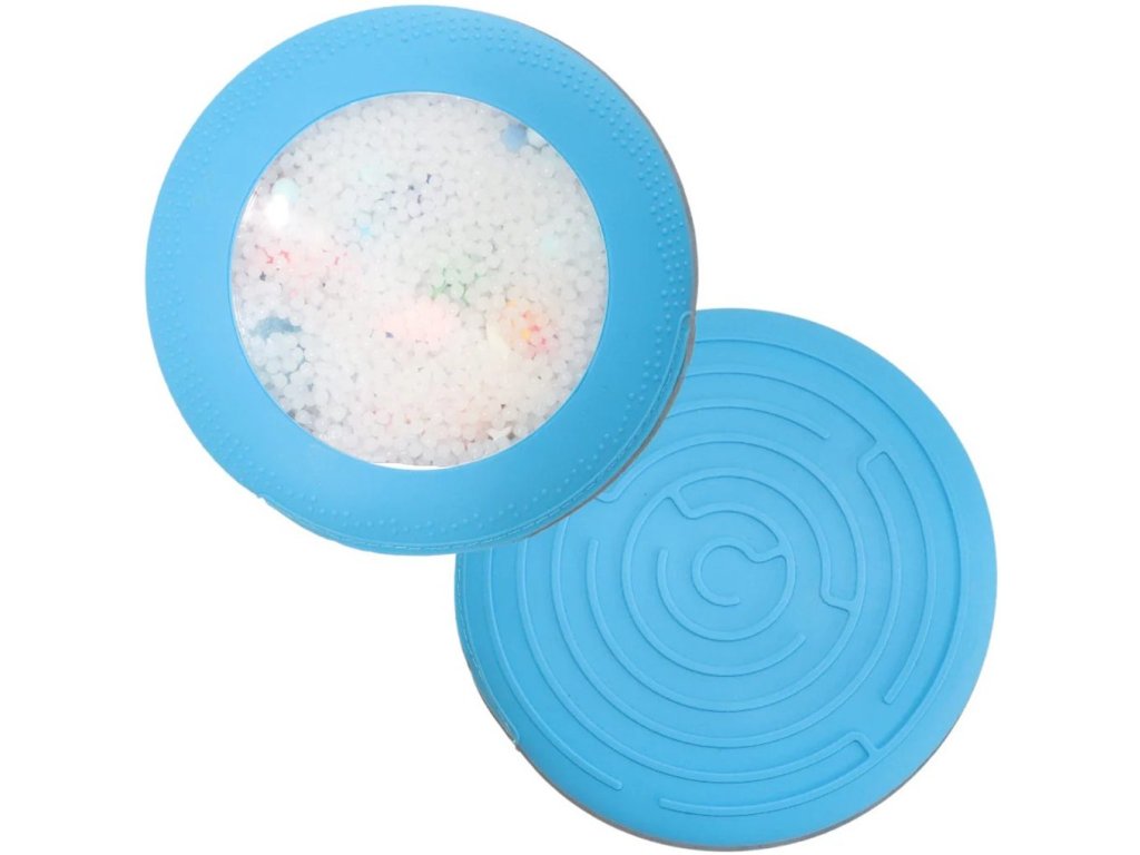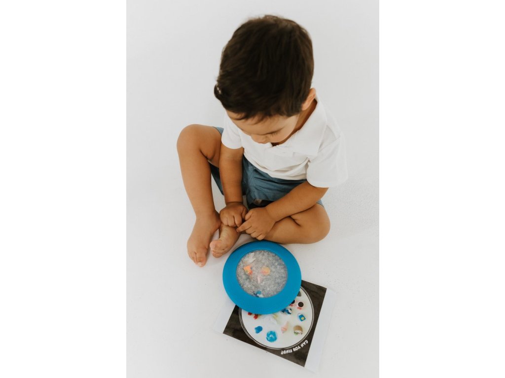 Mäkký silikónový disk s priehľadným okienkom ukrýva drobné nezávadné figúrky a guľôčky, ktoré môžu deti stláčať, tlačiť, posúvať, hľadať, naťahovať aj pátrať po skrytých pokladoch. Obľúbená hra „hľadaj a nájdi!“ tak dostáva nový rozmer a nikdy sa neomrzí. Hračka je ideálna pre malé ručičky, ktoré milujú stláčanie, objavovanie a skúmanie dotykom.