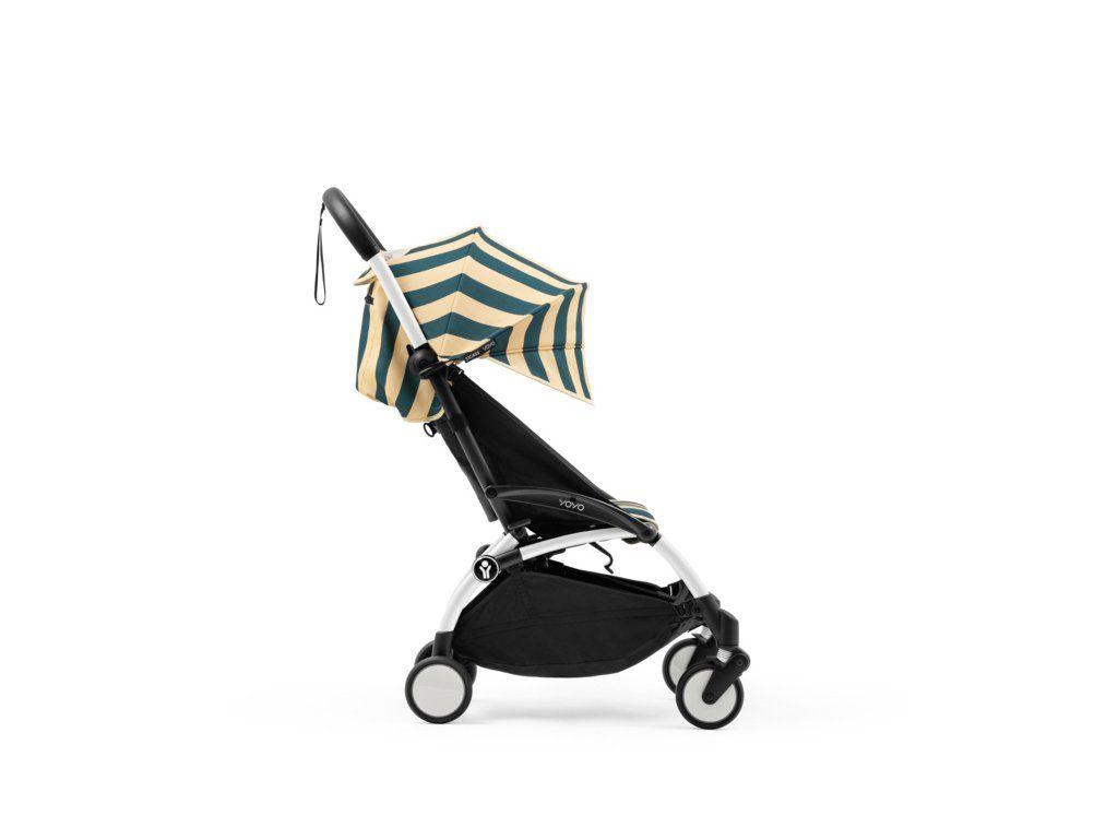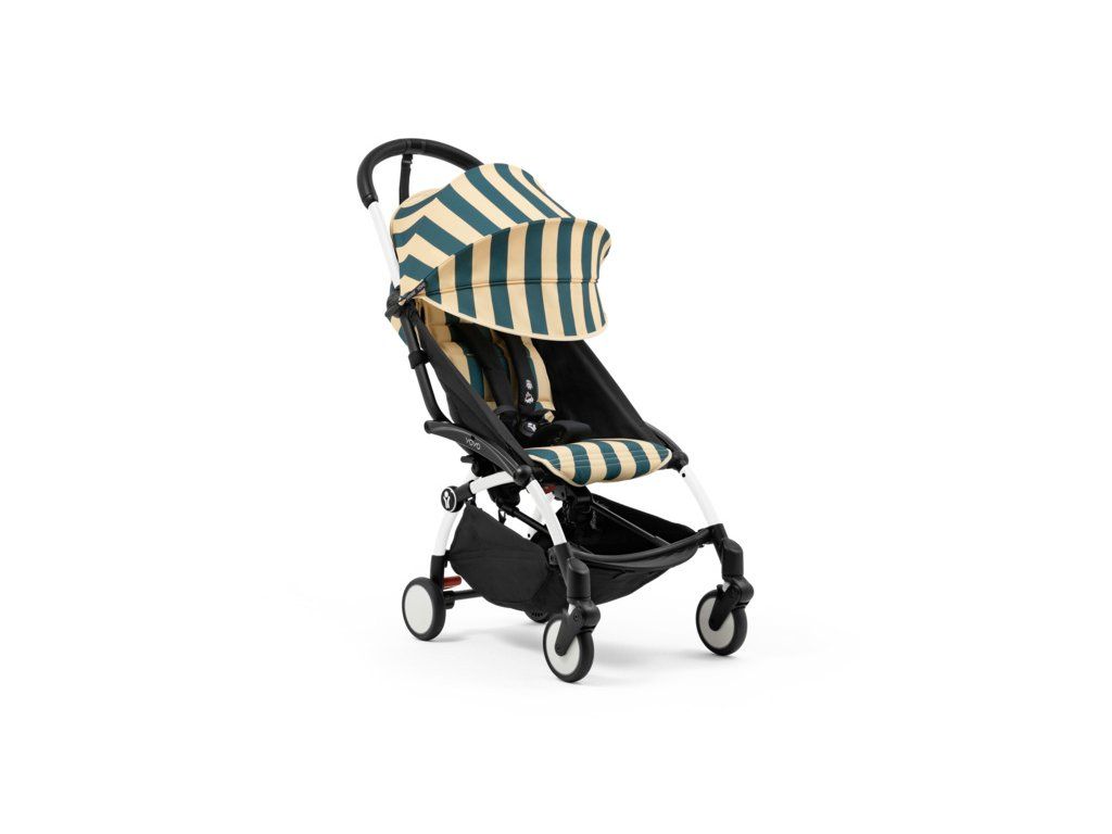 Color Pack 6+: Ikonické sedadlo a strieška YOYO textílie s novým žiarivým vzorom Monaco – sýta, tmavomodrá farba, s jemnými krémovými pruhmi
