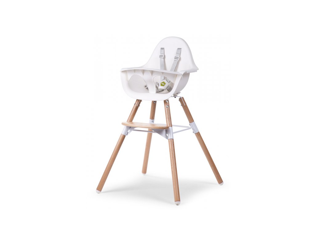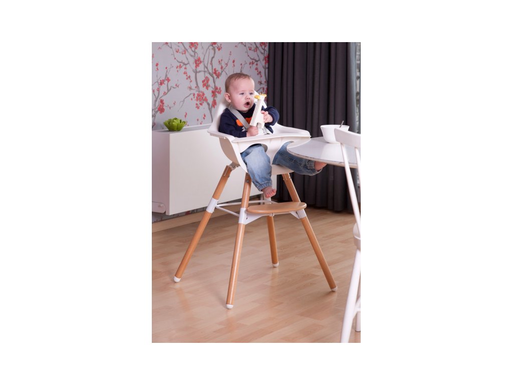 Moderná stolička 2v1 v kombinácii bukového dreva a bieleho plastu ponúka 2 výškové varainty použitia - k stolu štandardnej výšky 75 cm a k detskému stolíku výšky 50 cm. 5-bodový bezpečnostný pás, odnímateľné madlo a opierka nôh zaručujú pohodlné a bezpečné sedenie dieťaťa v stoličke.