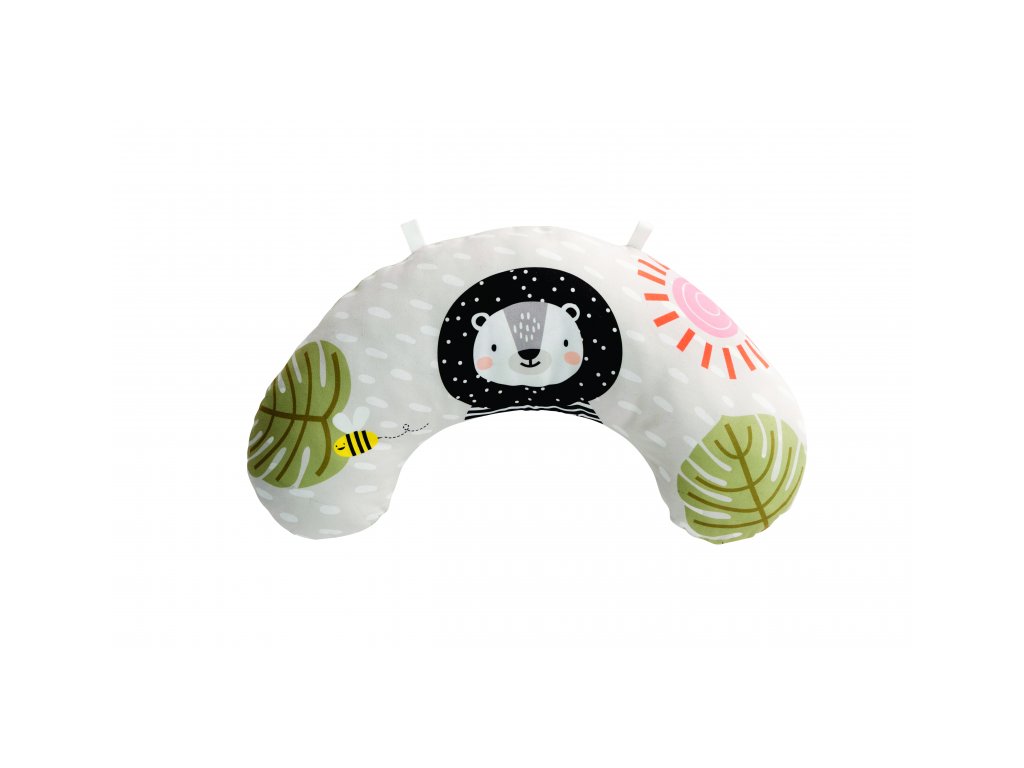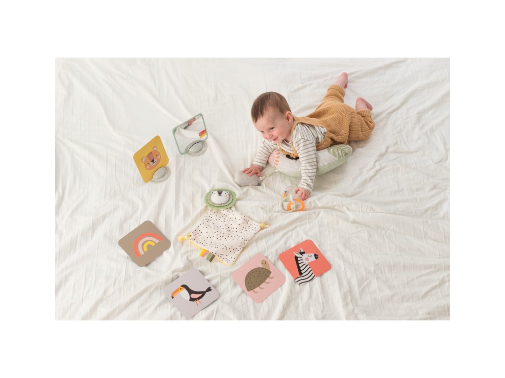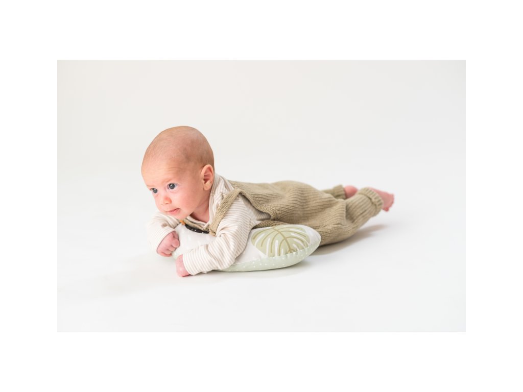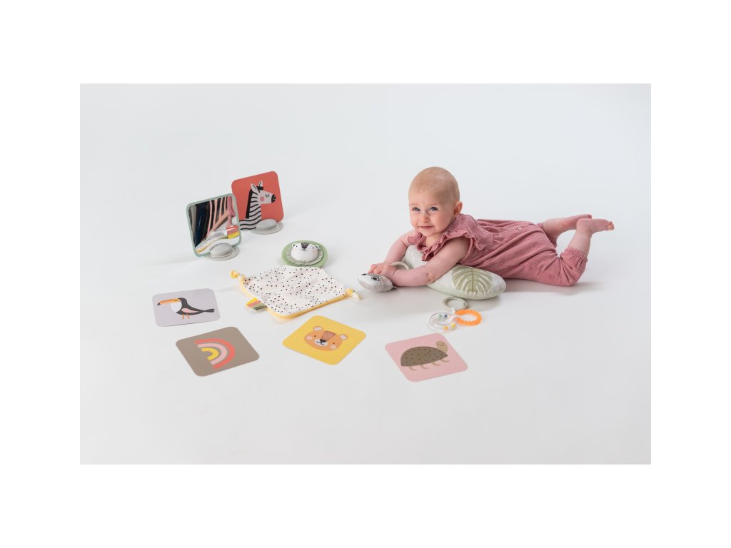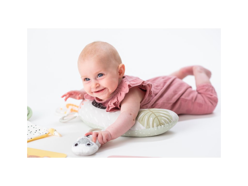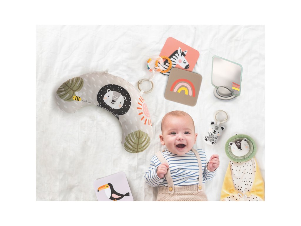 Vankúšik z mäkkého, príjemného materiálu je špeciálne navrhnutý, aby podporoval hranie dieťaťa na brušku. Súprava vysoko kontrastných obrázkov a bezpečného zrkadla s dvoma stojanmi je tiež určená na postavenie pred dieťa v polohe na brušku. Množstvo obrázkov, ktoré sada ponúka, umožňuje rodičom obrázky vymieňať a udržiavať tak dlhšie pozornosť dieťaťa. K vankúšiku je možné pripevniť aj hrkálku s hryzátkom a šuštiacu textilnú hračku v podobe roztomilého levíča.