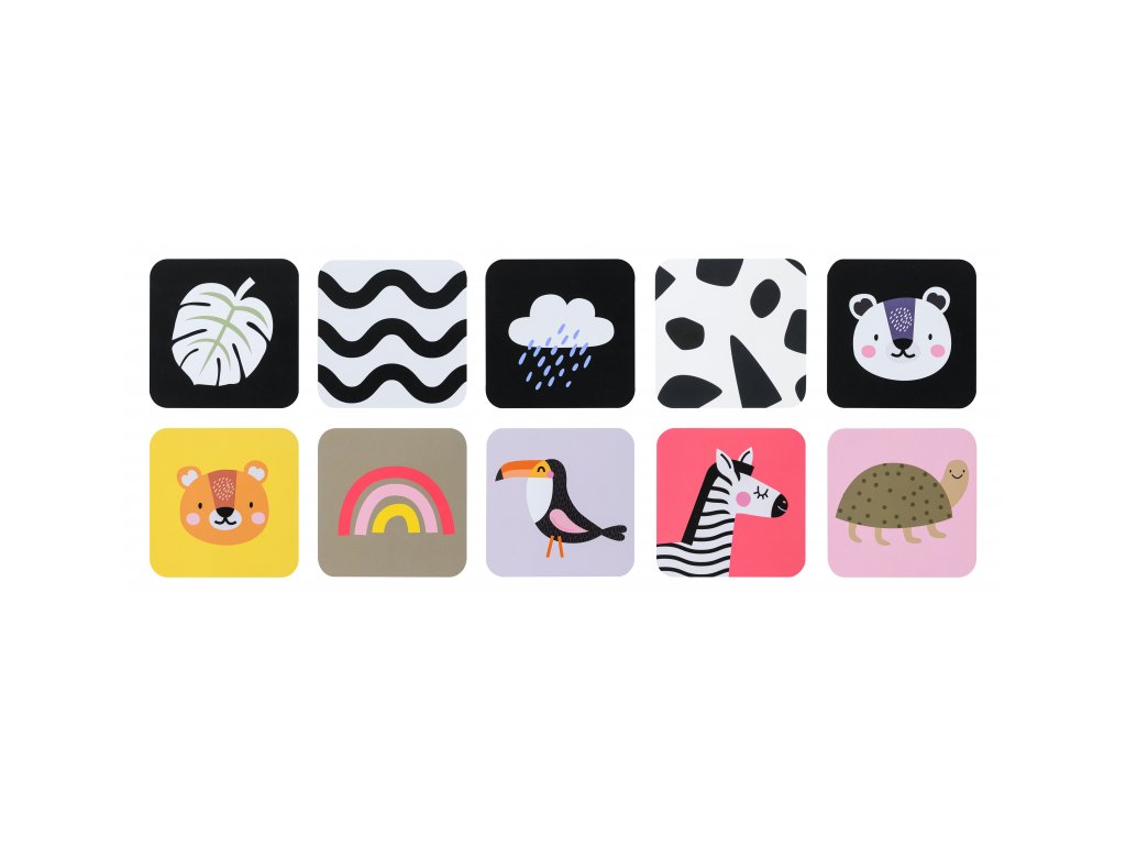 - 5 obojstranných kariet s 10 kontrastnými ilustráciami