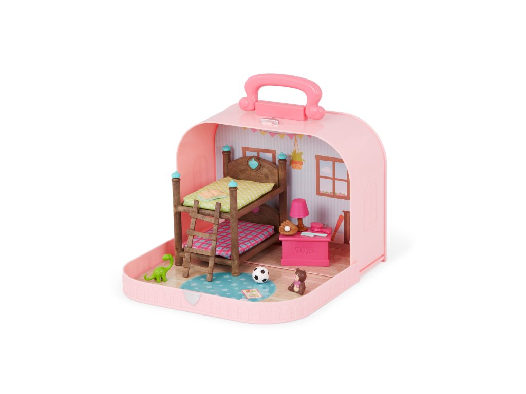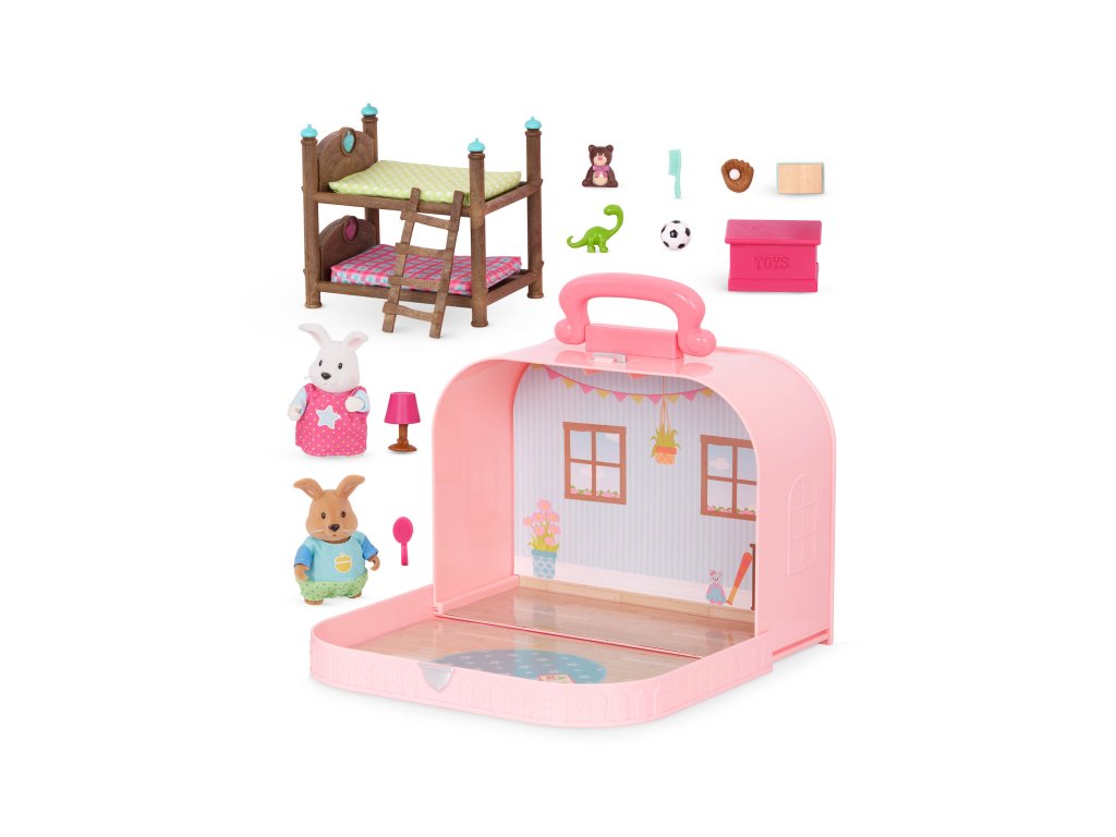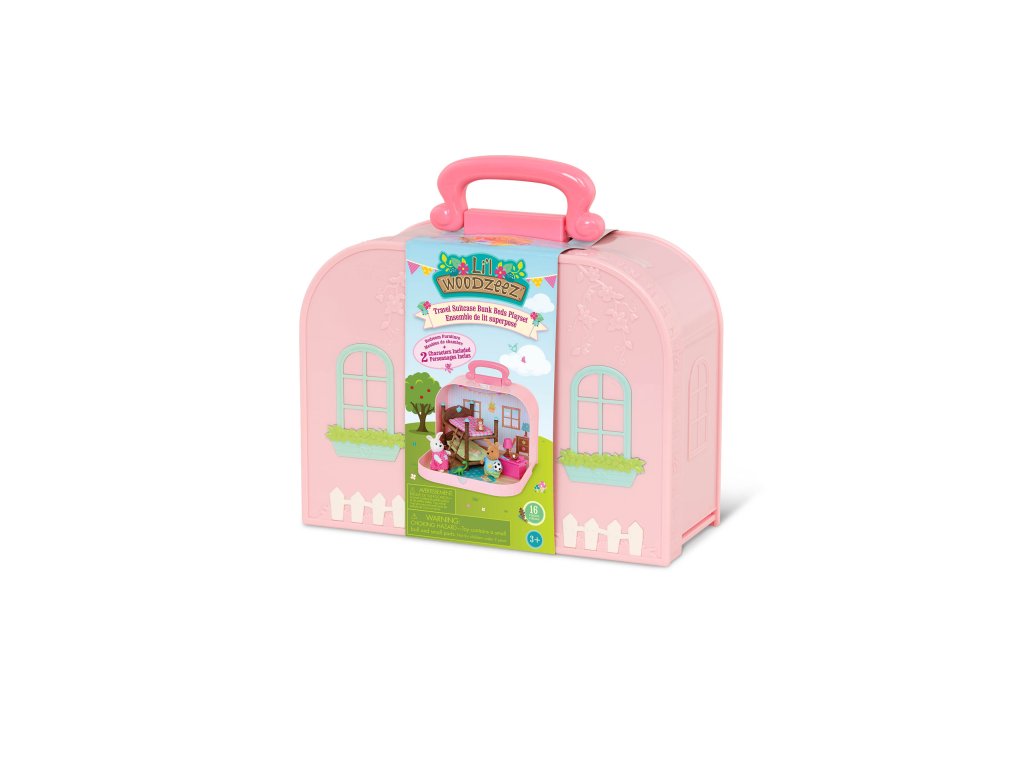 Cestovná sada hračiek Li'l Woodzeeze v praktickom kufríku umožní vášmu dieťaťu hrať sa so svojimi obľúbenými postavičkami kdekoľvek na dovolenke, výletoch či počas víkendu u starých rodičov. Kufrík sa po otvorení premení na bohato vybavenú detskú izbu s nábytkom, doplnkami a postavičkami králikov Chucka a Amelie.