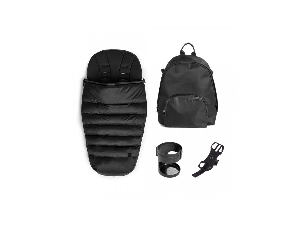 Sada doplnkov pre kočík Silver Cross Tide obsahuje luxusný fusak, štýlový prebaľovací batoh, držiak na nápoje a držiak na mobil.