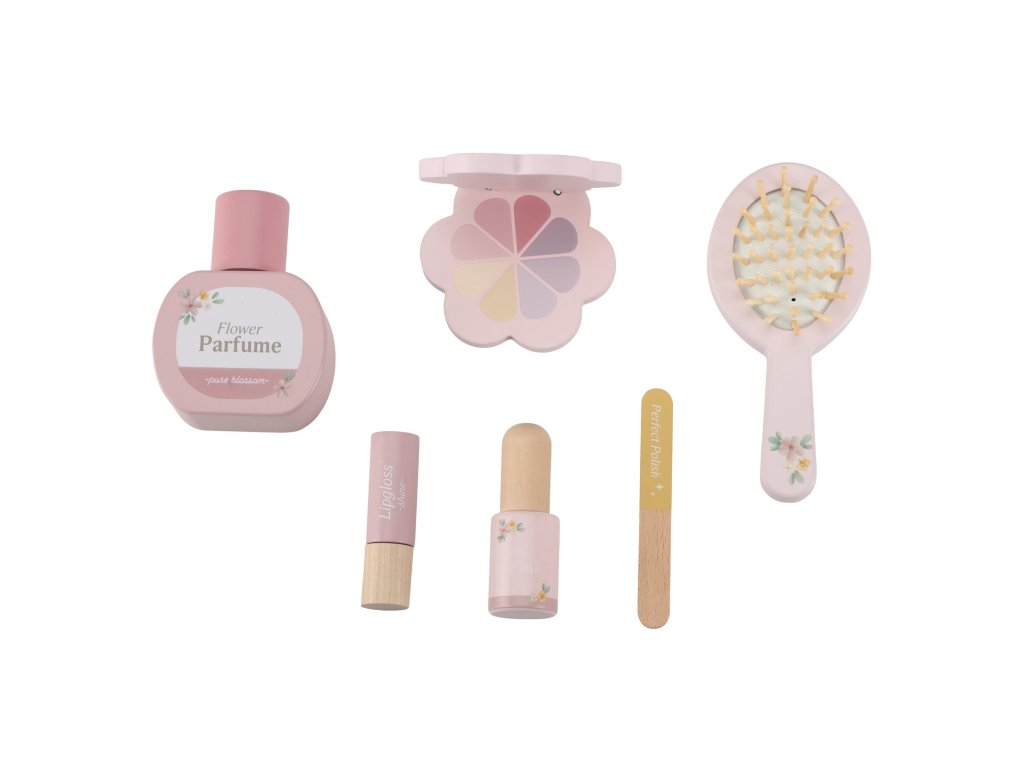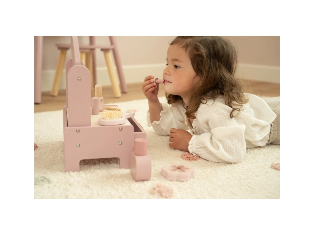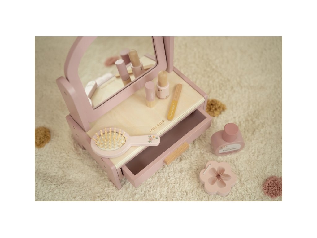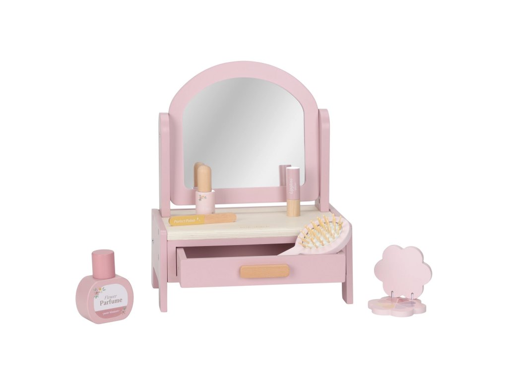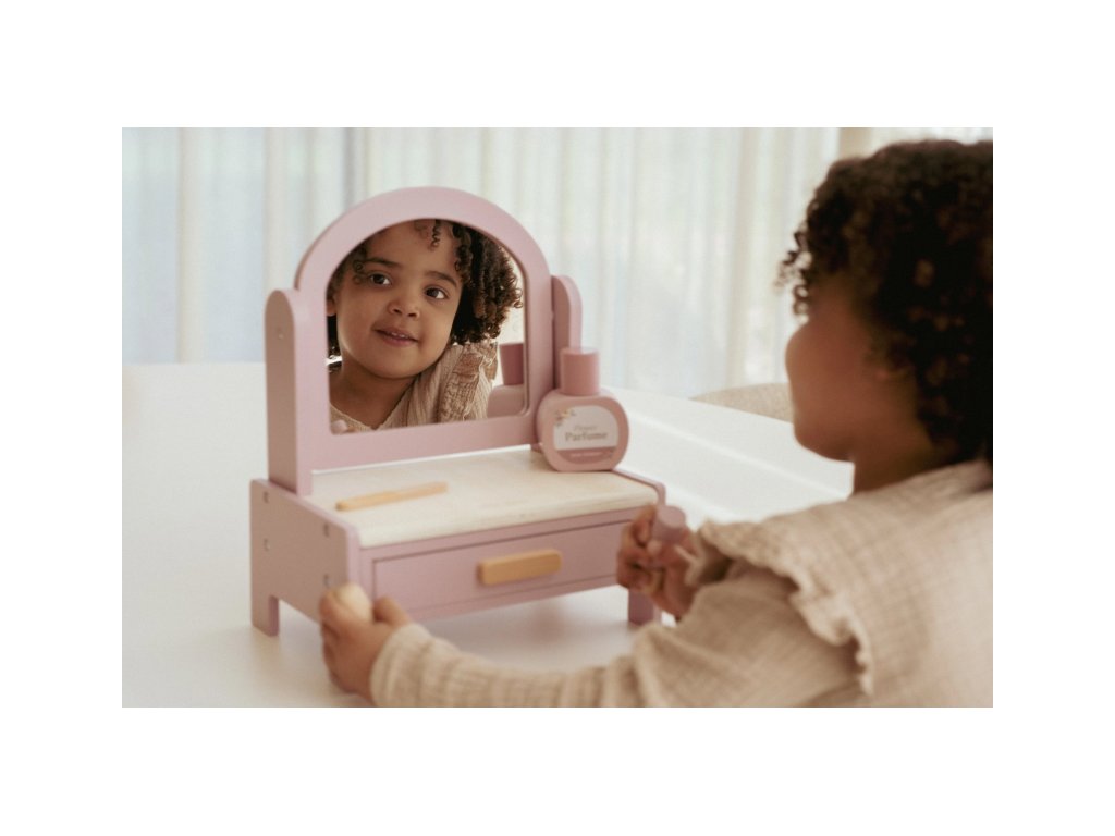 Toaletný stolík s doplnkami v drevenom prevedení poteší malú parádnicu a stane sa aj krásnou dekoráciou v detskej izbe. Stolík je vybavený otočným zrkadlom, kefou na vlasy, parfumom, rúžom, očnými tieňmi, pilníkom a lakom na nechty. Zásuvka je ideálna na uloženie drobností.