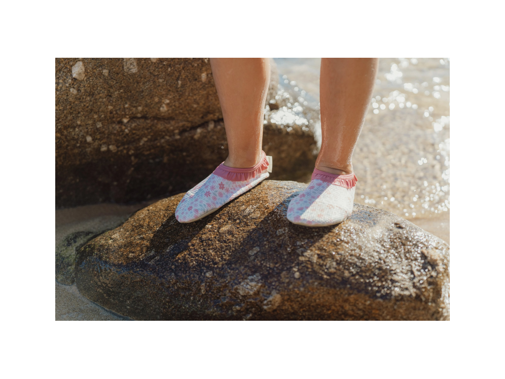 Topánky do vody z pružného materiálu s krásnou potlačou ochránia nožičky vášho dieťaťa pred horúcim plážovým pieskom aj pred pošmyknutím pri bazéne. Elastické prevedenie uľahčuje obúvanie aj vyzúvanie topánočiek.