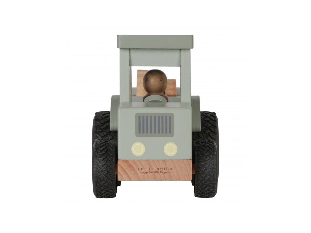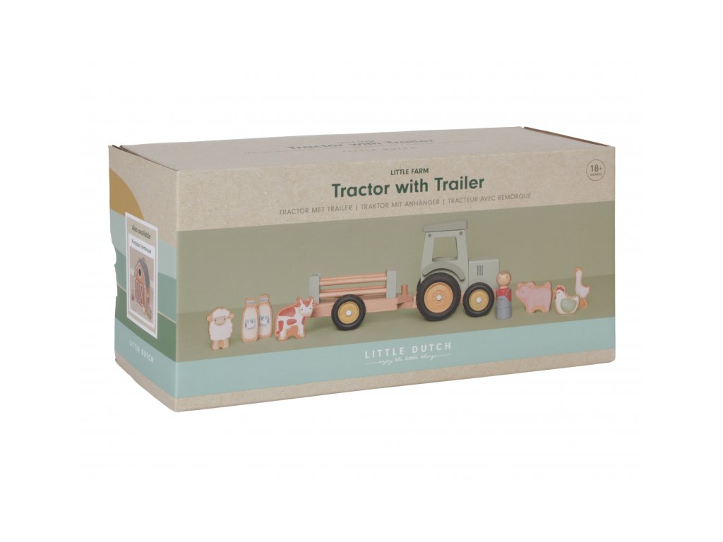 Drevený traktor s prívesom je tou pravou hračkou pre všetkých malých farmárov. Súčasťou balenia je aj postavička farmára, ktorý riadi traktor, päť zvieratiek a dve fľaše mlieka, ktoré sú ideálne na naloženie na príves.