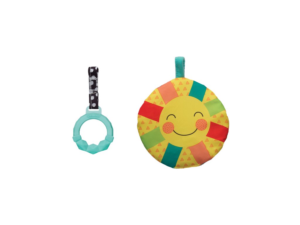 Odnímateľné hračky vrátane hryzátka je možné pripevniť na rôzne miesta na vankúšiku.